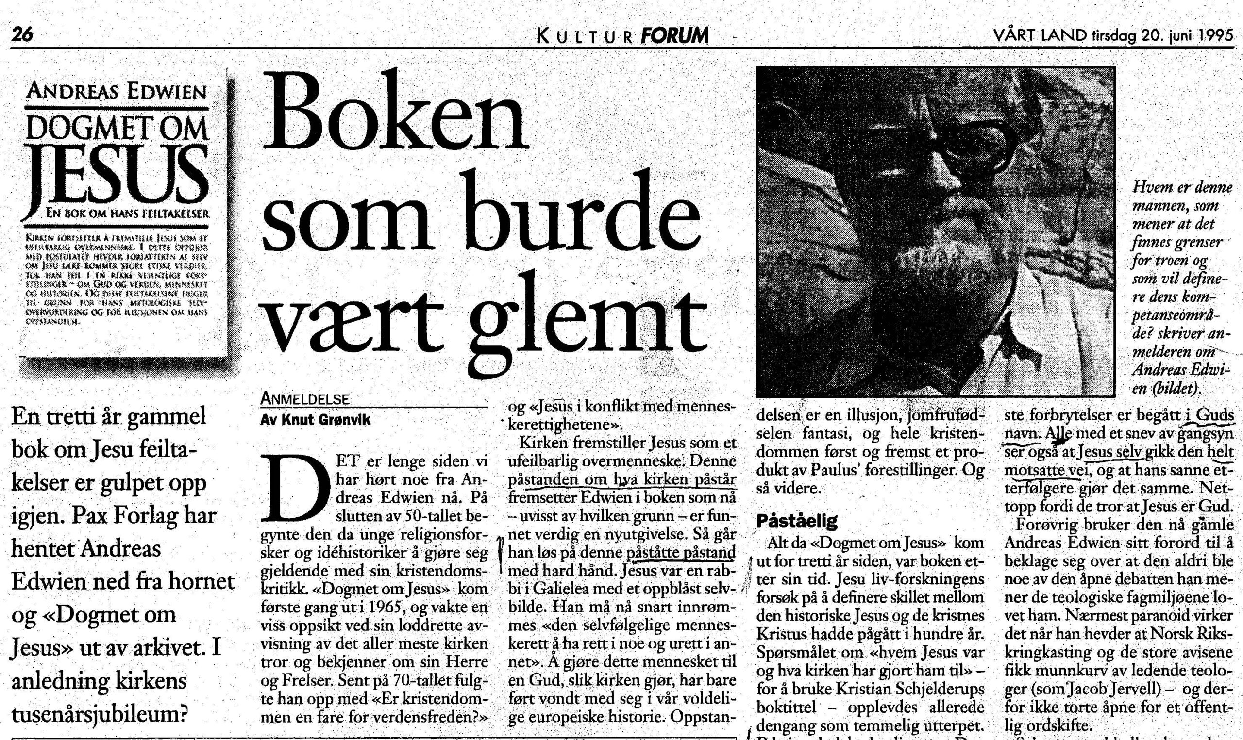 “Boken som burde vært glemt” er Vårt Lands betegnelse på min bok “Dogmet om Jesus”, som har undertittelen “En bok om hans feiltakelser” (l. utg. l965, femte oppl . l995, Pax Forlag). Anmelderen (Knut Grønvik) lanserer en fabelaktig ny forklaring på hvorfor mine teologiske motparter i løpet av disse år stort sett har forholdt seg tause til min kritikk av deres teologi om den overhistoriske og ufeilbarlige Jesus. Årsaken skal være at jeg selv “ikke ba om debatt”, men om mine “meningsmotstanderes fullstendige underkastelse”! Makeløst. Dette er mildt sagt det mest fantasifulle og uforskammete nonsens jeg tross lang erfaring som kirkens kritiker har blitt møtt med fra dens talsmenn. Siden Vårt Lands informasjon om min kritikk har vært minimal, må jeg be om nødvendig plass til en korreksjon av vrøvlet.